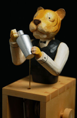 He is a neophyte bartender. So he is practicing how to shake a cocktail shaker briskly shaking his head and tail.