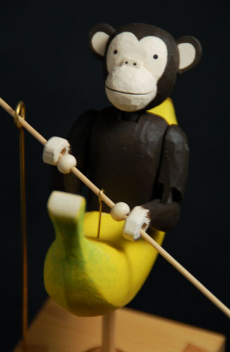 | One day, when he took a walk beside a river, he found a big banana floating out from upper course of a river. Then he thought there must be big banana trees somewhere. And now he is going upstream by the banana boat to search them. |